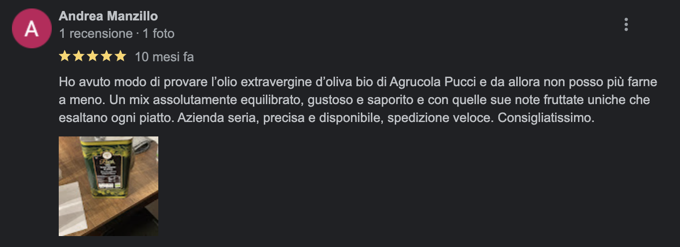 Con l'Azienda Agricola Pucci, la bontà arriva in un lampo. Ogni ordine viene gestito con prontezza e cura, garantendo consegne rapide direttamente alla tua porta. Con noi, non solo assapori l'eccellenza dell'olio, ma anche un servizio clienti tempestivo e affidabile. La tua soddisfazione, la nostra priorità.